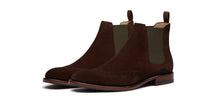 A classic Chelsea boot made from calf suede with a ¾ lining and insock in calf leather. The upper includes a brogued wingtip and back counter with twin elastic gussets in a contrasting khaki, and we’ve included a back pull tab in cotton webbing. The upper is blake stitched to a leather sole with a rubber top piece on the forepart for additional practicality, with a leather stacked heel.
