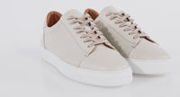 Our popular perforated trainer is a combination of smooth and punched off white calf leather with a matt finish. The upper pattern features a toe cap with a neatly folded seam, punched quarter panels, a padded collar and a bagged topline and tongue. Inside we’ve included a full calf leather lining and deep cushioned leather insole. The trainers are made in the traditional way and cemented to a lightweight cupsole secured with a side stitch.