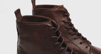 Our Chaves boot has been a favourite for a number of years now. The dark brown version is made from dip dyed calf leather – the boots are made up in a natural leather and dipped into a vat of dye to create a casual texture and a subtle non-uniformity of colour with burnishing at the toe and heel. This gives the boots an instant ‘old favourites’ appeal. The Derby style has a twin stitch row demarking a toe cap and twin stitch rows around the seams with a herringbone fabric back pull tab. Inside there is full calf leather lining and full leather insock. The Blake stitched leather sole includes a leather welt over the join to the upper and an inlaid rubber cleated tread for additional practicality.