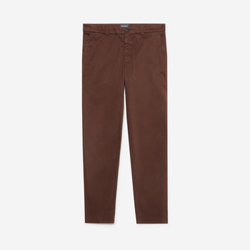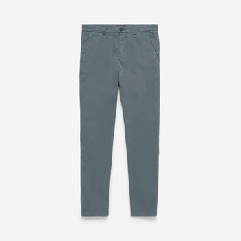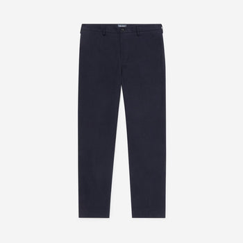 Our new chinos are an updated style with a more relaxed, straight leg fit. The navy cotton fabric has a soft, brushed feel and we have included a small amount of elastane for comfort. The chinos are garment dyed which creates a softness of colour with perfectly tonal threads. The style has two side angled front pockets with a ticket pocket on the right side and two jetted back pockets with a horn button to complement the waist button. Inside all the seams are impeccably bound in a lightweight soft cotton.
