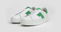 Our new premium trainers are made in Spain from white deerskin - a supple but strong leather with a naturally grainy texture. The classic lace to toe style is heightened with flashes of green soft calf suede around the collar, tongue top and quarters. We have added some gentle cushioning around the collar and back counter for comfort and a full supersoft calf leather lining and removable cushioned leather insock. The sole adds a point of difference; we have chosen a new, lightweight, smooth sided rubber cupsole with a deep, wide profile secured with a side stitch. The base of the sole has our new Oliver Sweeney branded green insert with a clear rubber coating.