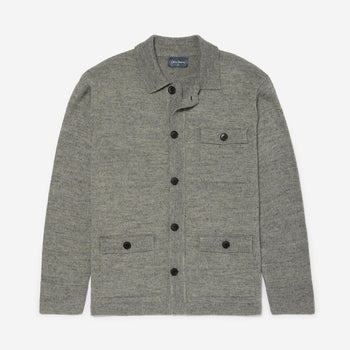 Our knitted Riviera shirt is made from 100% organic cotton from the great Trifitrofa Mill in Portugal. The camel marl coloured cotton is a fine gauge with a supersoft handle and fully fashioned with a dropped shoulder seam to create a clean profile. The fine jersey knit has a ribbed base, cuffs and breast pocket top with a contrasting navy stripe at the collar base and double stripe at the hem and cuffs. The front is trimmed with natural horn buttons.