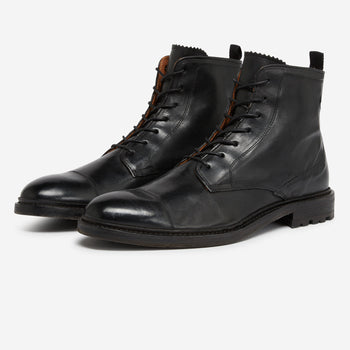 Our beautiful new sturdy Derby brogue boot has a great vintage aesthetic with a combination of milled and smooth calf leather. The classic wing tip pattern features brogue detailing and our signature punched toe motif. The upper section is in the textured milled grain with a neatly piped topline and two top ski hooks in antique brass. As you’d expect we’ve included a full calf leather lining and ¾ leather insock with a cushioned heel. The upper is Goodyear welted to a sturdy leather sole with a substantial stitched rand, in keeping with a fine heritage brogue.
