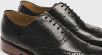 Our Aldeburgh oxford brogue has been your favourite for over 12 years now. We believe it’s the perfect proportions that make this style so versatile and timeless. The classic wingtip brogue has blind eyelets and a slightly elongated toe, which give it a clean profile and the versatility to dress up or down. The black calf leather upper is fully leather lined in calf leather with a leather insock, and Goodyear welted to a leather sole.