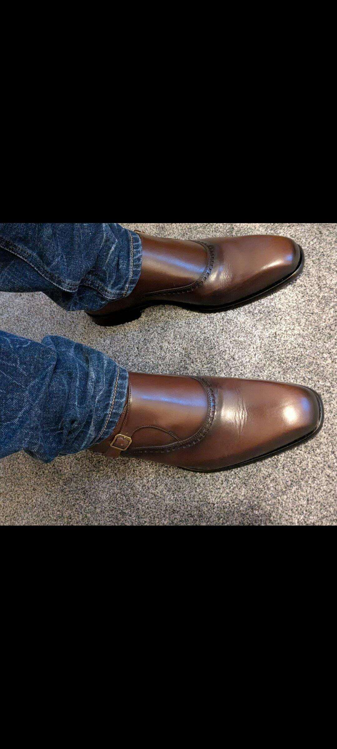 Our premium monk shoe is made in our artisan factory in Le March Italy. The formal design has clean lines with a row of laser cut detail sweeping around the front of the shoe. The three-hole adjustable single strap overlays the tongue, fastened with an antique brass buckle. The calf leather is finished in a dark brown; layer after layer of dye is applied by hand to create a real depth of colour, and then meticulously polished and antique finished, again, by hand. The upper has a piped topline and is fully lined in calf leather. We’ve chosen a slightly squared last to complement the clean styling and Blake stitched the upper to a leather sole with a closed channel to conceal the stitch.