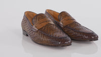 Our handwoven Bologna loafer is from our specialist factory in Spain. Fine strips of hand finished calf leather are woven to form a beautiful herringbone pattern, which is further enhanced by the subtle variation in the depth of colour of the individual strips. The pattern is wholecut, which maintains uniformity across the weave, and we’ve added an ‘aircord’ apron (rather than an actual seam). A piece of cord is sewn underneath before lasting – the heat then shrinks the leather over the cord forming a smooth raised seam. The upper has a smooth calf leather saddle, a neatly piped topline and is fully lined in calf leather. The Bologna construction replaces the traditional insole board with a leather 'sock' giving greater flexibility and comfort and is Blake stitched to a leather sole with a rubber forepart.