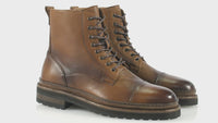 Our big bold Norwegian welted boot is made in our Italian factory in Le Marche. We’ve chosen an antiqued tan deerskin for the upper with a polished finish on the toe cap, fully lined in calf leather with a cushioned leather insock. Deerskin is a strong but supple leather with a soft ‘tumbled appearance’. The Norwegian welt covers the join between the sole and the upper giving extra strength and protection – we’ve used a deeper welt to create a bolder profile and finished it off with the sturdy St Moritz cleated rubber outsole. The trims are in an antiqued brass finish, which includes eight eyelets and a handy zip on the inside quarter, making the boots quick and easy to pull on and take off.