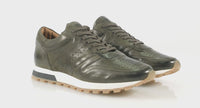 Our lightweight runner is made from Todi calf leather in khaki, polished by hand to produce a depth of colour and unique patina with a vintage 'old favourites' appeal. And they will feel like old favourites too, right from the start. The supple leather upper is fully leather lined with a cushioned leather insock and the padded collar and tongue are backed in suede to keep it all relaxed and comfortable. We've included some extra punch and stitch detail on the upper for a vintage aesthetic and reinforced the toe. The lightweight EVA midsole has a retro blue flash in the heel and a natural rubber cleated tread outsole.