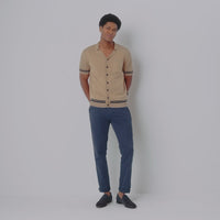 Our knitted Riviera shirt is made from 100% organic cotton from the great Trifitrofa Mill in Portugal. The camel marl coloured cotton is a fine gauge with a supersoft handle and fully fashioned with a dropped shoulder seam to create a clean profile. The fine jersey knit has a ribbed base, cuffs and breast pocket top with a contrasting navy stripe at the collar base and double stripe at the hem and cuffs. The front is trimmed with natural horn buttons.