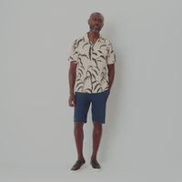 Our Riviera summer shirt is made from a soft cool 100% cotton fabric in a natural ecru shade with a bold leaf print in navy. This relaxed design features an open neck unstructured collar, short turned up sleeves, a single breast pocket, a lined yolk with a rear box pleat and straight hem with twin side vents. We’ve included a subtle embroidered logo on the lower placket and pearl effect buttons.