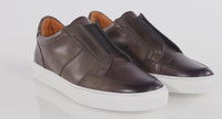 Our lightweight slip-on trainer from Italy is made from pristine calf leather, finished by hand. The upper has clean lines with plain facings and sturdy elastic for a secure flexible fit. We’ve included some light padding on the collar and a full leather lining with bagged topline and a leather insock. The upper is lasted in the traditional way with contrast white cupsole made from a lightweight EVA compound, secured with a side stitch.
