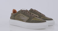 Our new casual trainer from Portugal is made from a combination of khaki Todi calf leather for the quarters and collar and soft Mastrotto suede on the facings tongue and toe guard. Todi is a smooth fine leather with a naturally casual colour. The trainer is accented with a white heel counter and tongue tab. Inside there is a full calf leather lining and cushioned leather insock. Made in the traditional way the uppers are cemented to a rubber cupsole with a broad profile and secured with a side stitch.