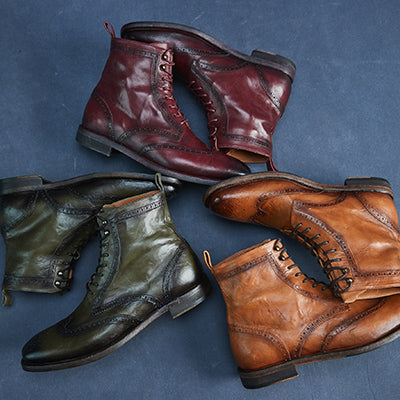 Our unique Sweeney Vintage collection combines premium calf leather and artisan craftsmanship to create a worn and lovingly restored look. Inspired by our Cobbler in Chief's grandfather's shoes, these vintage designs are built on wider squarer lasts. The finished boots are then washed and tumbled in machines before intensive hand polishing. This process creates instant 'worn in' comfort with a beautiful vintage aesthetic. Tasullo is our classic wingtip brogue boot from the range, in a burnished green calf leather with a full leather lining, Blake stitched to a leather sole with a rubber top piece.