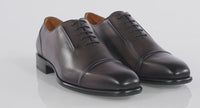 Our new premium, whole cut formal shoe from our artisan factory in Italy. A whole cut uses one large piece of leather from the prime cut of the hide. For detail we’ve added ‘aircord’ seams across the toe, by the facings and around the back counter. Cord is sewn into the upper before lasting – the heat then shrinks the leather over the cord to leave a beautifully smooth raised seam. The calf leather is finished in a dark grey; layer after layer of dye is applied by hand to create a real depth of colour, and then meticulously polished and antique finished, again, by hand. The upper has a piped topline and is fully lined in calf leather. We’ve chosen a slightly squared last to complement the clean styling and Blake stitched the upper to a leather sole with a closed channel to conceal the stitch.